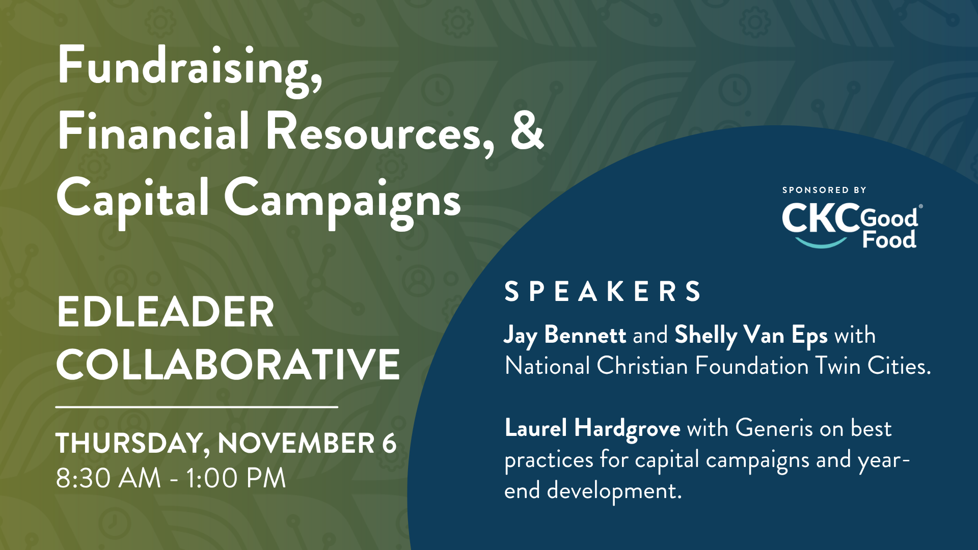 We’ll be hearing from Jay Bennett and Shelly Van Eps with the National Christian Foundation on partnering with Collaborative Schools to harvest financial resources, and from Laurel Hardgrove with Generis on best practices for capital campaigns and year-end development.